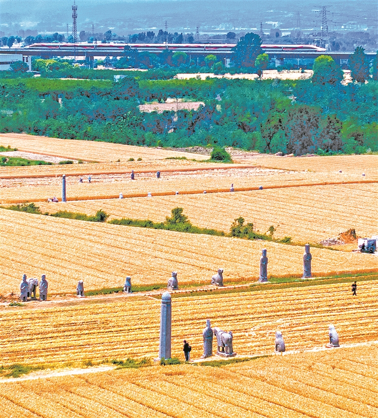6月2日,在河南省郑州市巩义市宋陵区,一幅跨越千年的画卷徐徐展开:银色的高铁列车疾驰于金色麦浪之间,与巍然矗立的北宋石刻相映成趣,奏响了一曲传统与现代交融的华彩乐章。