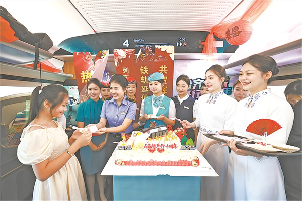 8月17日,我国最北高寒高铁哈齐高铁迎来开通运营十周年。图为当日,齐齐哈尔客运段列车工作人员在向旅客分发哈齐高铁十周年蛋糕。新华社记者 原 勇 摄